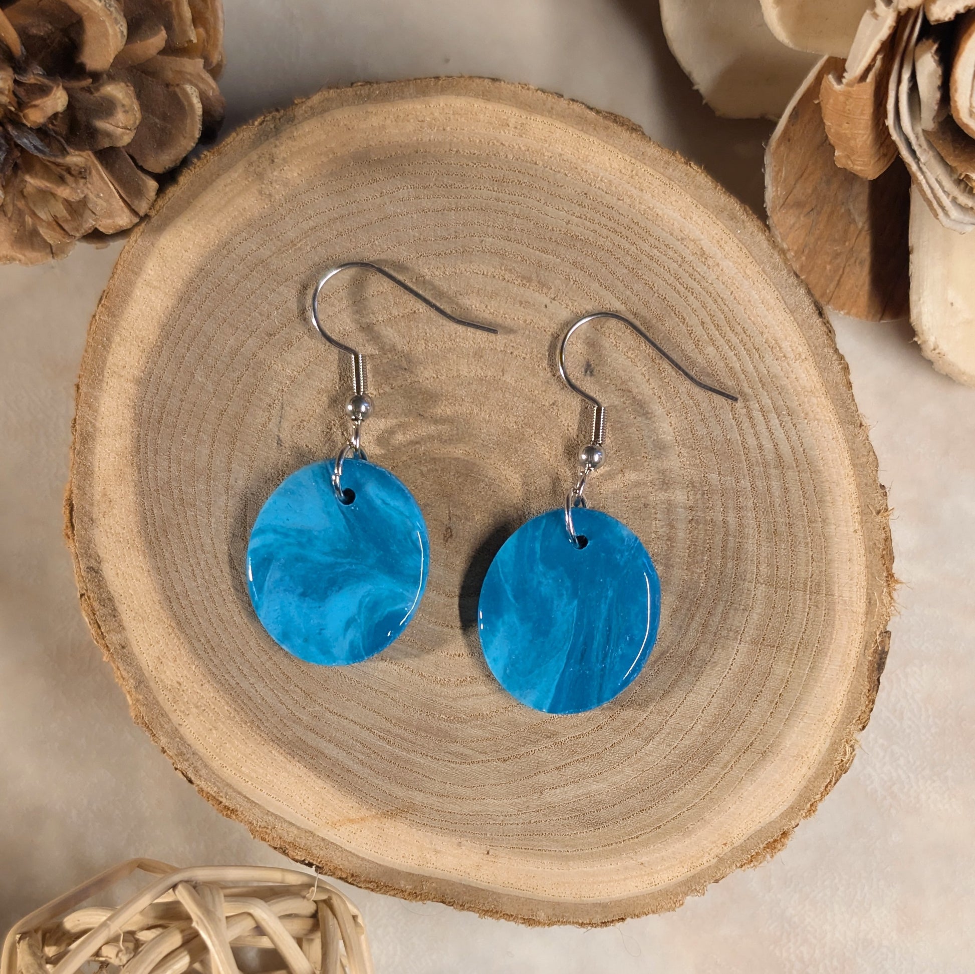 Des boucles d’oreilles aux nuances de bleu.
